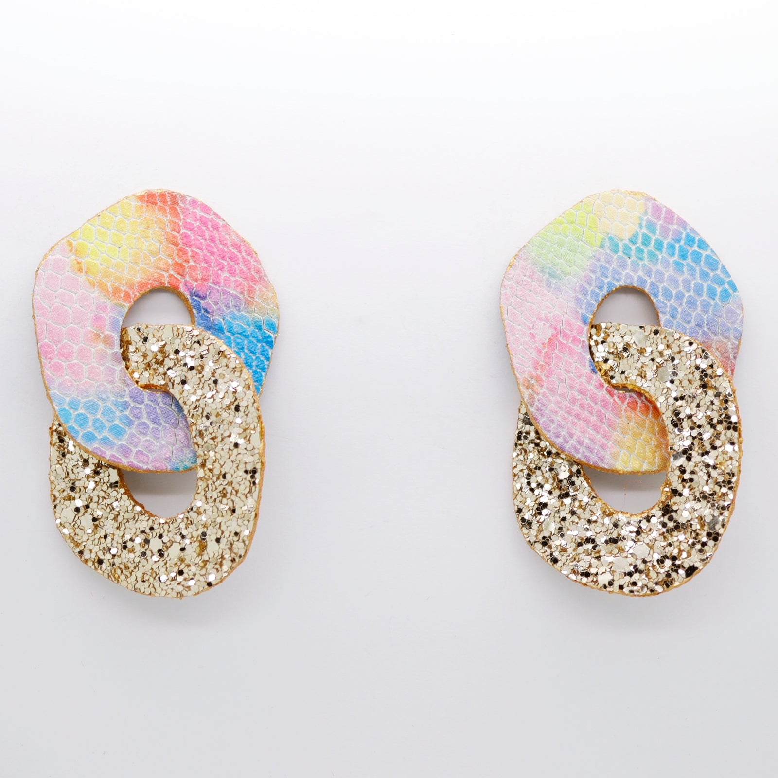 Boucles d'oreilles •DAGDA• en cuir reptile coloré et tissu à paillettes dorées.